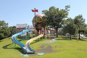 滑り台や雲梯が楽しめる複合遊具 太郎丸ウエストパークの複合遊具は、水色とオレンジが鮮やかな、テーマパークのようなデザインの遊具です。この遊具は2018年3月にリ